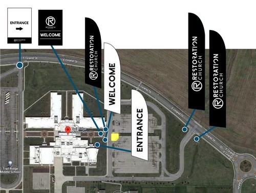 Look for our Black and White Restoration feather flags to know where to turn in. When you park, look for our white "ENTRANCE" flag to know which door to enter.